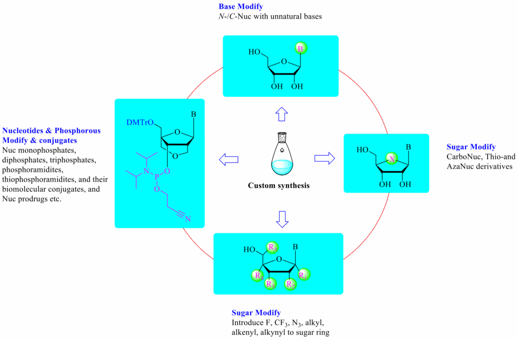Since the 1950s, extensive modifications of the sugar and the nucleobase moiety led to the identification of plenty of modified nucleosides with interesting antiviral potency, and dozens of nucleoside-based antivirals have been approved for the treatment of fatal viral infections, such as HIV, HBV, HCV, HSV etc. For instance, AZT became the first modified nucleoside therapeutics to fight HIV, and nucleos(t)ides-based cocktail therapy has turned HIV infection into a chronic disease, and Sofosbuvir, a HCV NS5B polymerase nucleotide inhibitor, led to the cure of HCV infection. Additionally, oligonucleotide therapy has attracted extensive attention in drug discovery and development due to its unique mechanism of action (MOA) on gene expression.